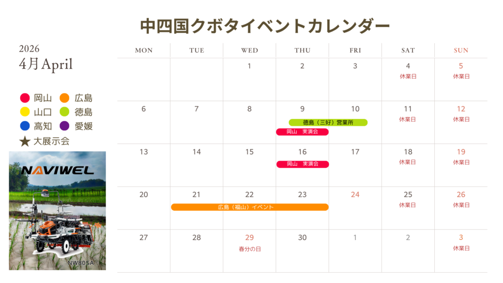 中四国クボタ 福山営業所移転記念! スペシャルウィーク 4/21(火)~4/23(木)